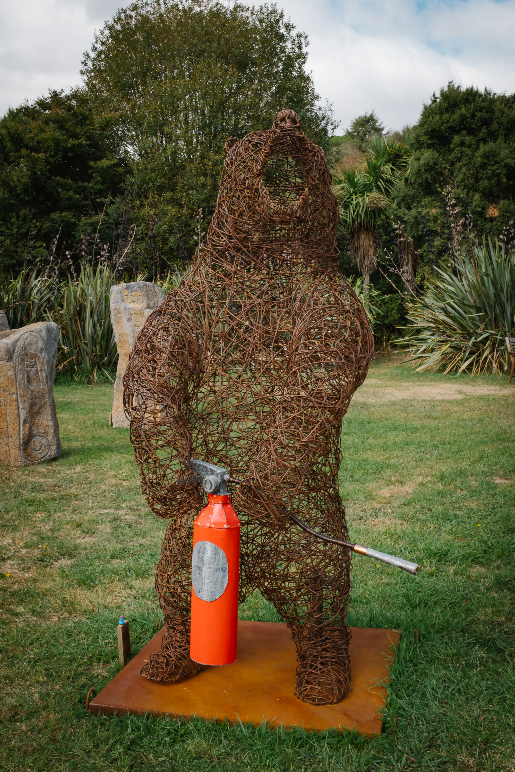 The exhibition pieces change every year, with careful selection by curator Melissa Reimer. There's real variety, in form, material, and style. Some echo the natural setting; feathers, birds, animals, and leaves, and natural, curving forms. Some are playful or surprising. In 2024, you might have turned a corner to discover three bright yellow loops, a rifleman bird in military attire, or a wirework bear holding a fire extinguisher.